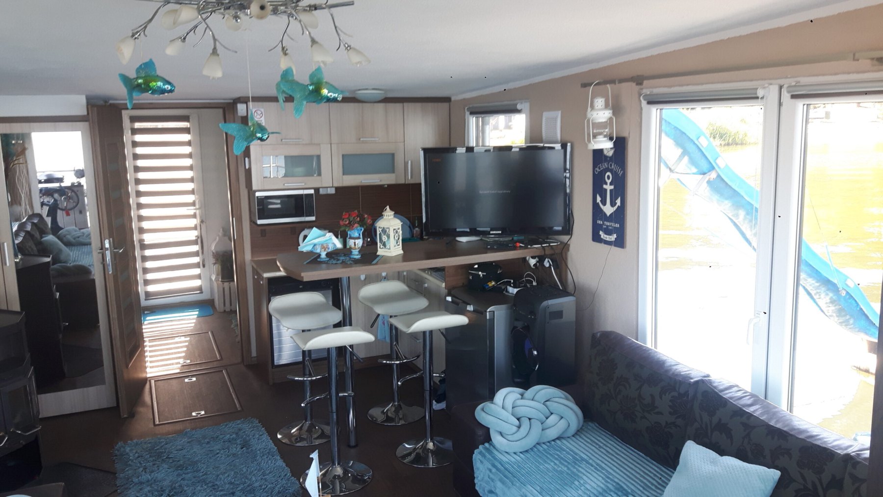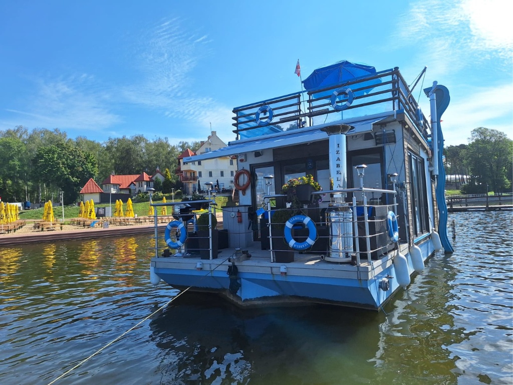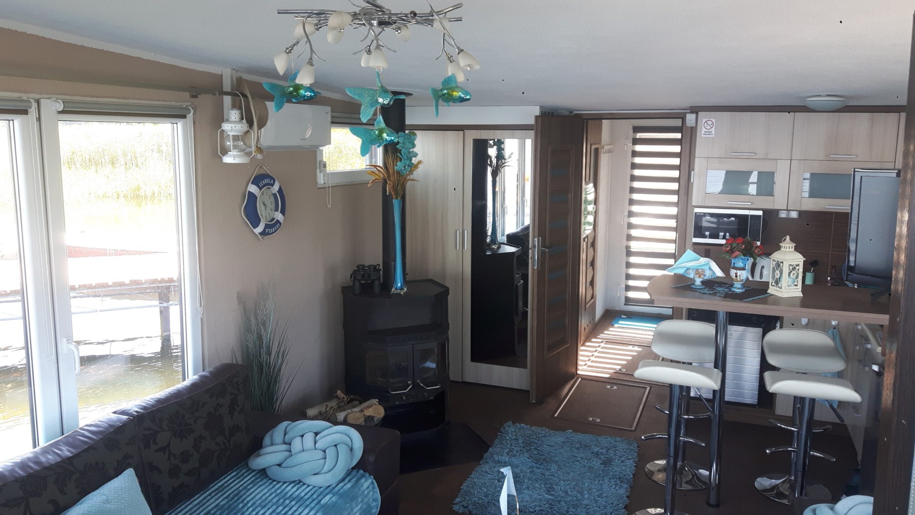 Pływający domek na wodzie HouseBoat służy jako samodzielny apartament, biuro, komfortowa platforma wędkarska, przystosowany i wyposażony tak, aby nasi goście poczuli się wyjątkowo i komfortowo. Składa się z salonu z dwoma sofami rozkładanymi dwuosobowymi (1.40m x 2.00m) z aneksem kuchennym oraz sypialni z podwójnym łóżkiem (1.60m x 2.00m), telewizorem oraz z łazienką z kabiną prysznicową.