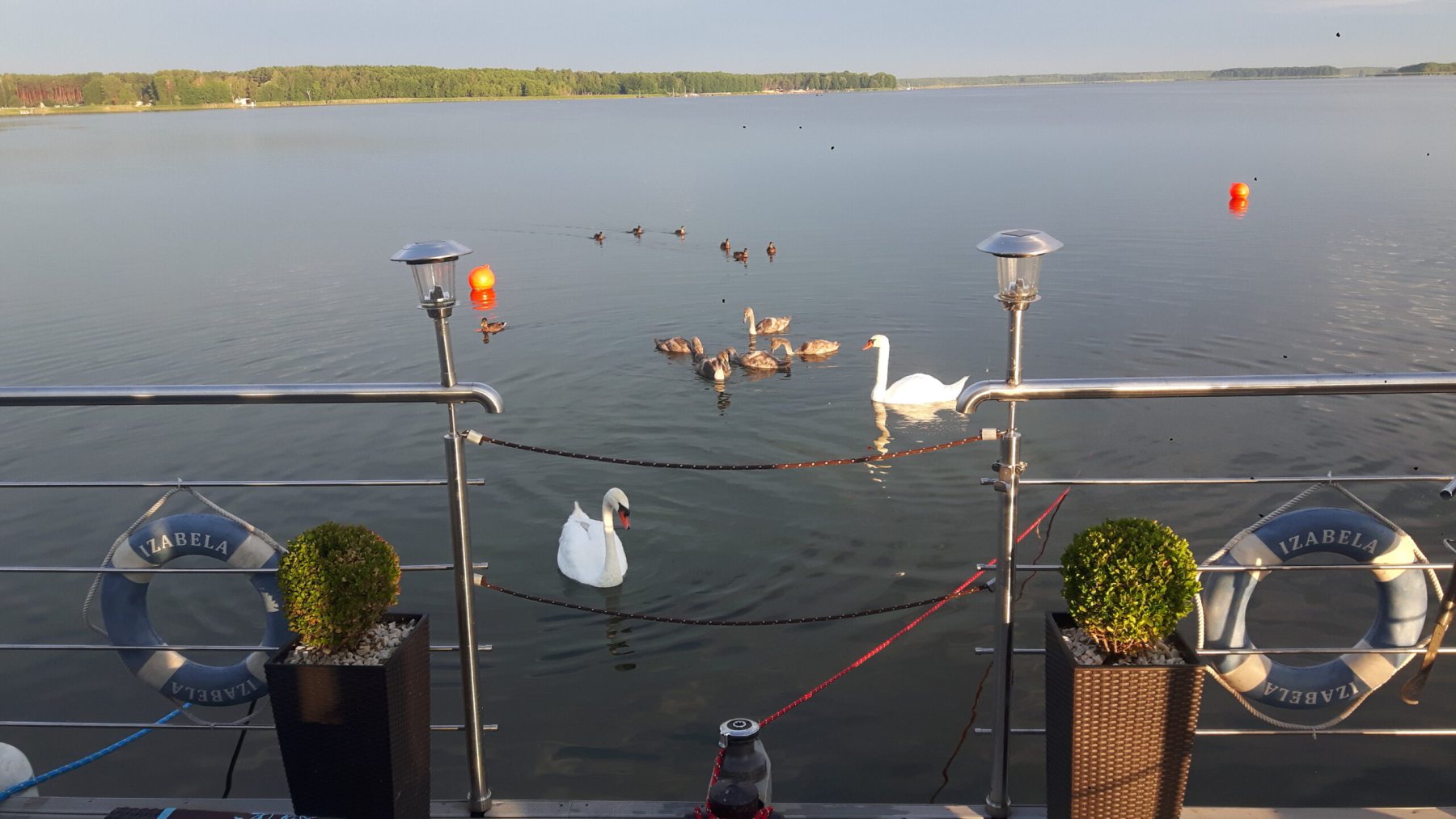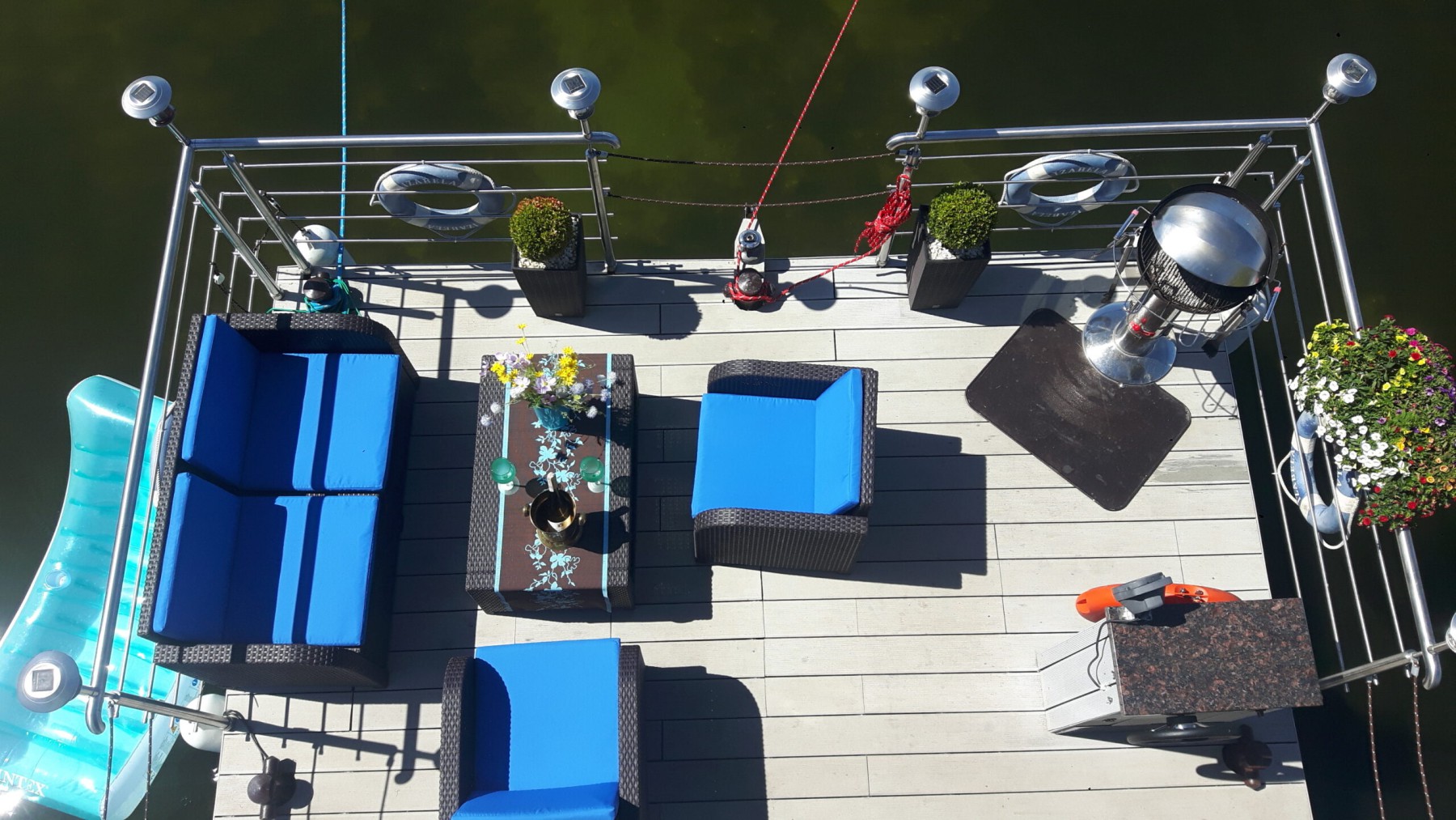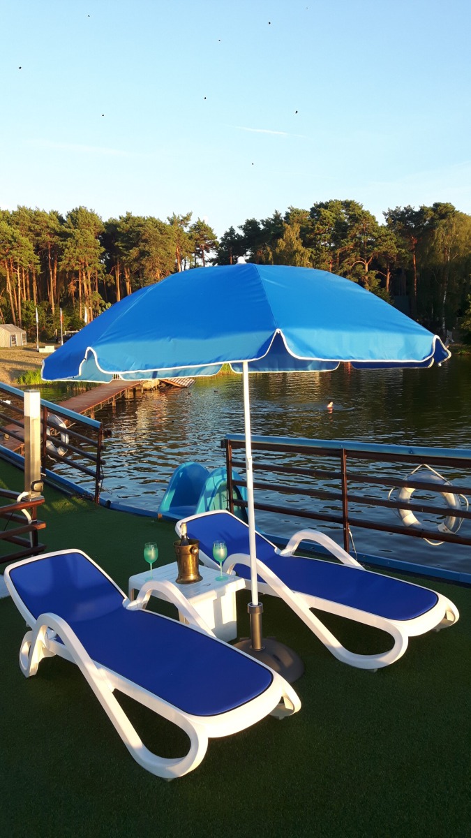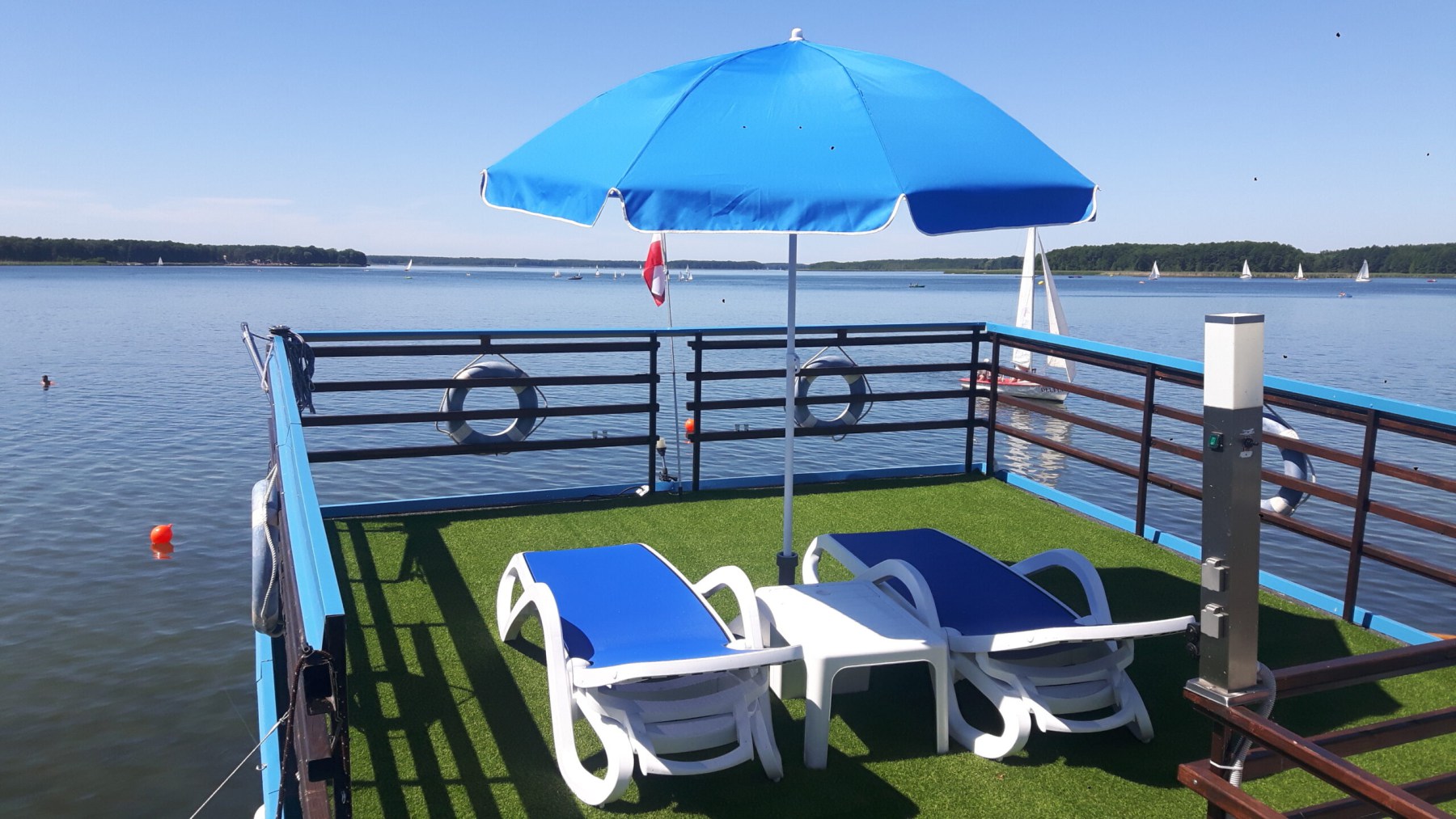 Dodatkowo na terenie obiektu znajdują się dwa tarasy. Taras na górze pozwala na pełne korzystanie z kąpieli słonecznych i gwarantuje piękne widoki. Aby umilić Państwu czas wiosną, latem, jesienią czy zimą, w parach, rodzinnie czy w grupie znajomych, dlatego zorganizuj tu ROCZNICĘ, URODZINY, ZARĘCZYNY. Udostępniamy miejsce do grillowania oraz sześcio metrową ślizgawkę na pokładzie naszego obiektu. W wyposażeniu jest również ponton czteroosobowy z silnikiem zaburtowym.